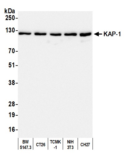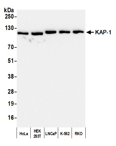 | Immunogen: | synthetic peptide. The epitope recognized by A300-275A-T maps to a region between residue 650 and 700 of human Tripartite Motif-Containing 28 using the numbering given in entry NP_005753.1 (GeneID 10155). |