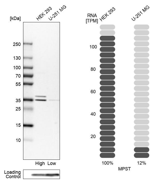 Protein function: Transfer of a sulfur ion to cyanide or to other thiol compounds. Also has weak rhodanese activity. Detoxifies cyanide and is required for thiosulfate biosynthesis. Acts as an antioxidant. In combination with cysteine aminotransferase (CAT), contributes to the catabolism of cysteine and is an important producer of hydrogen sulfide in the brain, retina and vascular endothelial cells. Hydrogen sulfide H(2)S is an important synaptic modulator, signaling molecule, smooth muscle contractor and neuroprotectant. Its production by the 3MST/CAT pathway is regulated by calcium ions. [The UniProt Consortium] Buffer: 40% glycerol and PBS (pH 7.2). 0.02% sodium azide is added as preservative. Highest antigen sequence identity to mouse: 81% and to rat: 82%