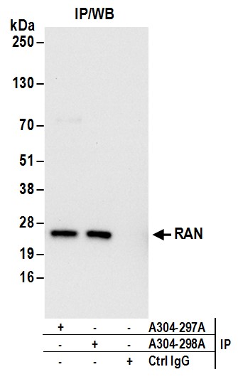| Immunogen: | synthetic peptide. The epitope recognized by A304-297A-T maps to a region between residue 175 to 225 of human RAs-Related Nuclear Protein using the numbering given in entry NP_006316.1 (GeneID 5901). |