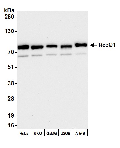 | Immunogen: | synthetic peptide. The epitope recognized by A300-447A-T maps to a region between residues 1 and 50 of human RecQ protein-like (DNA helicase Q1-like) 1 using the numbering given in Swiss-Prot entry P46063 (GeneID 5965). |