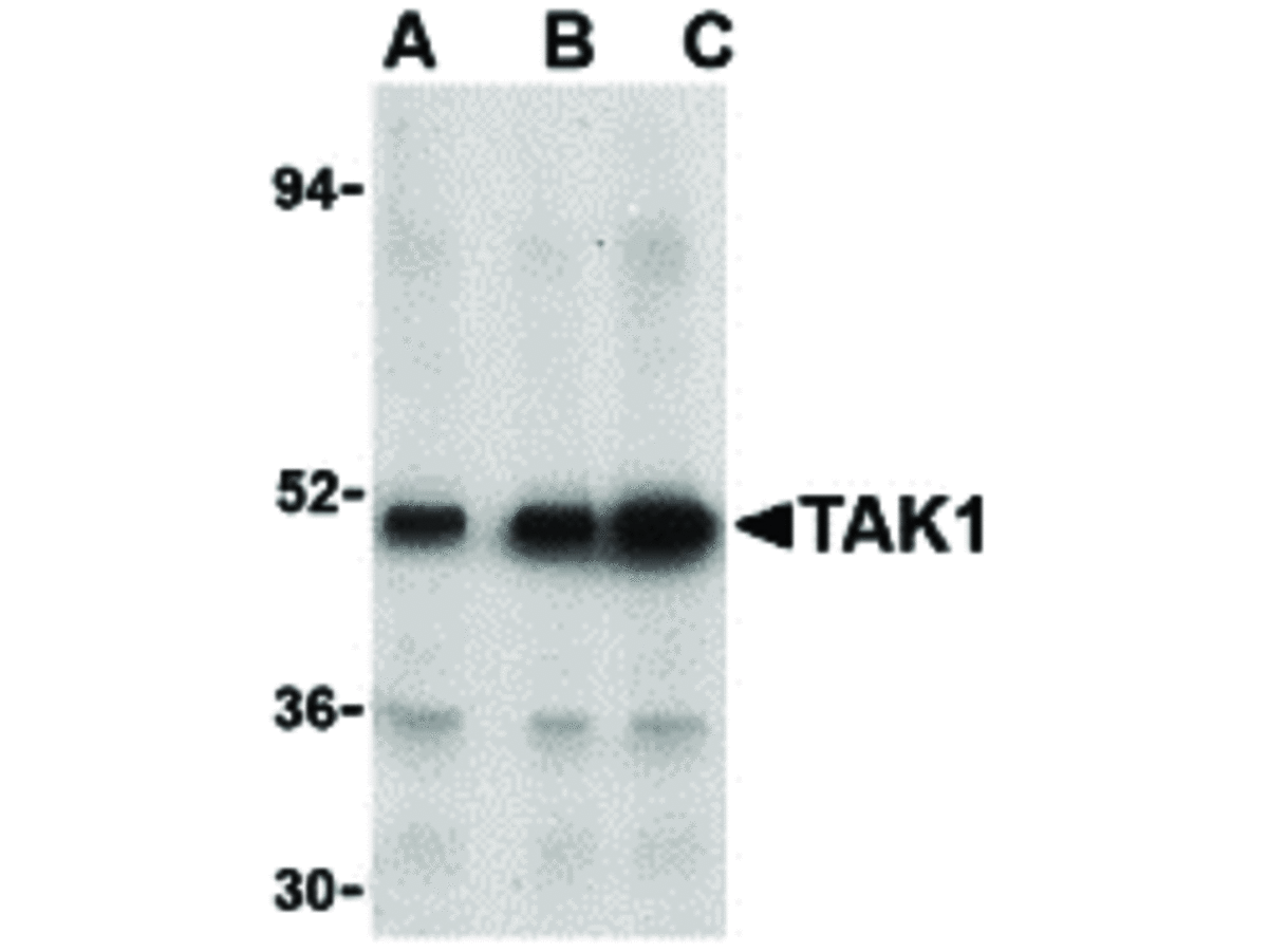 Anti-TAK1 Antibody was affinity purified from monospecific antiserum by immunoaffinity chromatography. Cross reactivity with TAK1 from other sources has not been determined. Protein function: May be an important signaling intermediate between TGFB receptors and MAP3K7/TAK1. May play an important role in mammalian embryogenesis. [The UniProt Consortium]