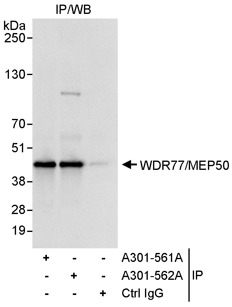 | Immunogen: | synthetic peptide. The epitope recognized by A301-561A-T maps to a region between residue 1 and 50 of human WD repeat domain 77 (methylosome protein 50) using the numbering given in entry NP_077007.1 (GeneID 79084). |