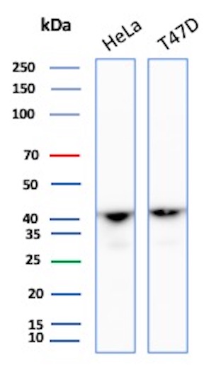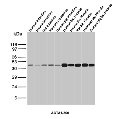 Formulation: Purified Ab WITHOUT BSA and Azide at 1.0mg/ml. Cellular Localization: Cytoplasm, Cytoskeleton. Positive Control: Hela or T47D cells, Human Intestine, Mouse Intestine, Rat Intestine, Hamster Intestine, Guinea pig Intestine, Human skeletal muscle, Mouse skeletal muscle, Rat skeletal muscle, Hamster skeletal muscle or Guinea pig skeletal muscle. Chromosome Location: 1q42.13. Protein Function: Actins are highly conserved proteins that are involved in various types of cell motility and are ubiquitously expressed in all eukaryotic cells [The Uniprot Consortium]