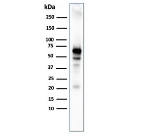 1 mg/ml in 1X PBS, BSA free, sodium azide free. Recognizes a protein of 62kDa, which is identified as AKT1. The serine/threonine kinase Akt family contains several members, including Akt1 (also designated PKB or RacPK), Akt2 (also designated PKB tyrosine residues 740 and 751, which bind the subunit of the phosphatidylinositol 3-kinase (PI 3-kinase) complex. Activation of Akt1 by insulin or insulin-growth factor-1 (IGF-1) results in phosphorylation of both Thr 308 and Ser 473. Akt proteins become phosphorylated and activated in insulin/IGF-1-stimulated cells by an upstream kinase(s), and the activation of Akt1 and Akt2 is inhibited by the PI kinase inhibitor wortmannin. Protein function: AKT1 is one of 3 closely related serine/threonine-protein kinases (AKT1, AKT2 and AKT3) called the AKT kinase, and which regulate many processes including metabolism, proliferation, cell survival, growth and angiogenesis (PubMed:15526160, PubMed:11882383, PubMed:21620960, PubMed:21432781). This is mediated through serine and/or threonine phosphorylation of a range of downstream substrates (PubMed:15526160, PubMed:11882383, PubMed:21620960, PubMed:21432781). Over 100 substrate candidates have been reported so far, but for most of them, no isoform specificity has been reported (PubMed:15526160, PubMed:11882383, PubMed:21620960, PubMed:21432781). AKT is responsible of the regulation of glucose uptake by mediating insulin-induced translocation of the SLC2A4/GLUT4 glucose transporter to the cell surface. Phosphorylation of PTPN1 at 'Ser-50' negatively modulates its phosphatase activity preventing dephosphorylation of the insulin receptor and the attenuation of insulin signaling. Phosphorylation of TBC1D4 triggers the binding of this effector to inhibitory 14-3-3 proteins, which is required for insulin-stimulated glucose transport (PubMed:11994271). AKT regulates also the storage of glucose in the form of glycogen by phosphorylating GSK3A at 'Ser-21' and GSK3B at 'Ser-9', resulting in inhibition of its kinase activity. Phosphorylation of GSK3 isoforms by AKT is also thought to be one mechanism by which cell proliferation is driven. AKT regulates also cell survival via the phosphorylation of MAP3K5 (apoptosis signal-related kinase) (PubMed:11154276). Phosphorylation of 'Ser-83' decreases MAP3K5 kinase activity stimulated by oxidative stress and thereby prevents apoptosis (PubMed:11154276). AKT mediates insulin-stimulated protein synthesis by phosphorylating TSC2 at 'Ser-939' and 'Thr-1462', thereby activating mTORC1 signaling and leading to both phosphorylation of 4E- BP1 and in activation of RPS6KB1 (PubMed:12150915). AKT is involved in the phosphorylation of members of the FOXO factors (Forkhead family of transcription factors), leading to binding of 14-3-3 proteins and cytoplasmic localization (PubMed:10358075). In particular, FOXO1 is phosphorylated at 'Thr-24', 'Ser-256' and 'Ser-319' (PubMed:10358075). FOXO3 and FOXO4 are phosphorylated on equivalent sites (PubMed:10358075). AKT has an important role in the regulation of NF- kappa-B-dependent gene transcription and positively regulates the activity of CREB1 (cyclic AMP (cAMP)-response element binding protein) (PubMed:9829964). The phosphorylation of CREB1 induces the binding of accessory proteins that are necessary for the transcription of pro- survival genes such as BCL2 and MCL1 (PubMed:9829964). AKT phosphorylates 'Ser-454' on ATP citrate lyase (ACLY), thereby potentially regulating ACLY activity and fatty acid synthesis. Activates the 3B isoform of cyclic nucleotide phosphodiesterase (PDE3B) via phosphorylation of 'Ser-273', resulting in reduced cyclic AMP levels and inhibition of lipolysis. Phosphorylates PIKFYVE on 'Ser-318', which results in increased PI(3)P-5 activity. The Rho GTPase-activating protein DLC1 is another substrate and its phosphorylation is implicated in the regulation cell proliferation and cell growth. AKT plays a role as key modulator of the AKT-mTOR signaling pathway controlling the tempo of the process of newborn neurons integration during adult neurogenesis, including correct neuron positioning, dendritic development and synapse formation. Signals downstream of phosphatidylinositol 3-kinase (PI(3)K) to mediate the effects of various growth factors such as platelet-derived growth factor (PDGF), epidermal growth factor (EGF), insulin and insulin-like growth factor I (IGF-I) (PubMed:12176338, PubMed:12964941). AKT mediates the antiapoptotic effects of IGF-I. Essential for the SPATA13-mediated regulation of cell migration and adhesion assembly and disassembly (PubMed:19934221). May be involved in the regulation of the placental development. Phosphorylates STK4/MST1 at 'Thr-120' and 'Thr-387' leading to inhibition of its: kinase activity, nuclear translocation, autophosphorylation and ability to phosphorylate FOXO3 (PubMed:17726016). Phosphorylates STK3/MST2 at 'Thr-117' and 'Thr-384' leading to inhibition of its: cleavage, kinase activity, autophosphorylation at Thr-180, binding to RASSF1 and nuclear translocation (PubMed:20086174, PubMed:20231902). Phosphorylates SRPK2 and enhances its kinase activity towards SRSF2 and ACIN1 and promotes its nuclear translocation (PubMed:19592491). Phosphorylates RAF1 at 'Ser-259' and negatively regulates its activity (PubMed:10576742). Phosphorylation of BAD stimulates its pro-apoptotic activity (PubMed:10926925). Phosphorylates KAT6A at 'Thr-369' and this phosphorylation inhibits the interaction of KAT6A with PML and negatively regulates its acetylation activity towards p53/TP53 (PubMed:23431171). Phosphorylates palladin (PALLD), modulating cytoskeletal organization and cell motility (PubMed:20471940). Phosphorylates prohibitin (PHB), playing an important role in cell metabolism and proliferation (PubMed:18507042). Phosphorylates CDKN1A, for which phosphorylation at 'Thr-145' induces its release from CDK2 and cytoplasmic relocalization (PubMed:16982699). These recent findings indicate that the AK