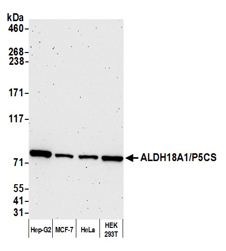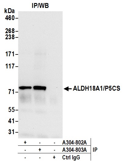 | Immunogen: | synthetic peptide. The epitope recognized by A304-803A-T maps to a region between residue 745 to 795 of human Aldehyde Dehydrogenase 18 Family, Member A1 using the numbering given in entry P54886.2 (GeneID 5832). |