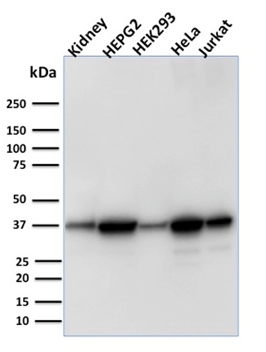 Formulation: Purified Ab with BSA and Azide at 200ug/ml. Cellular Localization: Cytoplasm. Positive Control: 293T, HEK293, A431, HeLa, HePG2, Jurkat and Raji whole cell lysates, Human Kidney, Human colon carcinoma tissue., MOLT4. Chromosome Location: 7q33. Protein Function: Catalyzes the NADPH-dependent reduction of a wide variety of carbonyl-containing compounds to their corresponding alcohols. Displays enzymatic activity towards endogenous metabolites such as aromatic and aliphatic aldehydes, ketones, monosacharides, bile acids and xenobiotics substrates. Key enzyme in the polyol pathway, catalyzes reduction of glucose to sorbitol during hyperglycemia (PubMed:1936586). Reduces steroids and their derivatives and prostaglandins. Displays low enzymatic activity toward all-trans-retinal, 9-cis-retinal, and 13-cis-retinal (PubMed:12732097, PubMed:19010934, PubMed:8343525). Catalyzes the reduction of diverse phospholipid aldehydes such as 1-palmitoyl-2-(5-oxovaleroyl)-sn -glycero-3-phosphoethanolamin (POVPC) and related phospholipid aldehydes that are generated from the oxydation of phosphotidylcholine and phosphatdyleethanolamides (PubMed:17381426). Plays a role in detoxifying dietary and lipid-derived unsaturated carbonyls, such as crotonaldehyde, 4-hydroxynonenal, trans-2-hexenal, trans-2,4-hexadienal and their glutathione-conjugates carbonyls (GS-carbonyls) (PubMed:21329684) [The Uniprot Consortium]
