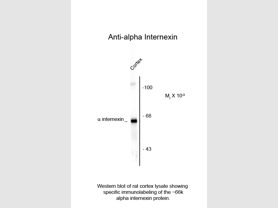 Anti-Alpha Internexin Antibody is directed against rat Alpha Internexin proteins. The antibody was purified from chiken eggs as an IgY fraction. This antibody is directed against rat alpha internexin protein. Reactivity is expected from mouse and human. Cross reactivity with Alpha Internexin from other species has not been determined Protein function: Class-IV neuronal intermediate filament that is able to self-assemble. It is involved in the morphogenesis of neurons. It may form an independent structural network without the involvement of other neurofilaments or it may cooperate with NF-L to form the filamentous backbone to which NF-M and NF-H attach to form the cross-bridges. [The UniProt Consortium]