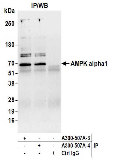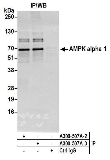 Immunogen: synthetic peptide. The epitope recognized by A300-507A-T maps to a region between residues 350 and 400 of human 5'-AMP-activated Protein Kinase, catalytic Alpha-1 chain using the numbering given in entry BAA36547.1 (GeneID 5562).