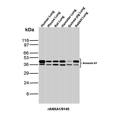 Formulation: Purified Ab with BSA and Azide at 200ug/ml. Cellular Localization: Apical cell membrane, Basolateral cell membrane, Cell membrane, Cell projection, Cilium, Cytoplasm, Cytoplasmic vesicle, Cytoplasmic vesicle membrane, Early endosome, Endosome membrane, Extracellular exosome, Extracellular space, Lateral cell membrane, Membrane, Nucleus, Phagocytic cup, Secreted, Secretory vesicle lumen. Positive Control: A431 and K562 cell lysates, A549, human esophagus, Human Intestine, Lung, placenta and prostate tissues. Chromosome Location: 9q21.13. Protein Function: Plays important roles in the innate immune response as effector of glucocorticoid-mediated responses and regulator of the inflammatory process. Has anti-inflammatory activity (PubMed:8425544). Plays a role in glucocorticoid-mediated down-regulation of the early phase of the inflammatory response (By similarity). Contributes to the adaptive immune response by enhancing signaling cascades that are triggered by T-cell activation, regulates differentiation and proliferation of activated T-cells (PubMed:17008549). Promotes the differentiation of T-cells into Th1 cells and negatively regulates differentiation into Th2 cells (PubMed:17008549). Has no effect on unstimulated T cells (PubMed:17008549). Negatively regulates hormone exocytosis via activation of the formyl peptide receptors and reorganization of the actin cytoskeleton (PubMed:19625660). Has high affinity for Ca(2+) and can bind up to eight Ca(2+) ions (By similarity). Displays Ca(2+)-dependent binding to phospholipid membranes (PubMed:2532504, PubMed:8557678). Plays a role in the formation of phagocytic cups and phagosomes. Plays a role in phagocytosis by mediating the Ca(2+)-dependent interaction between phagosomes and the actin cytoskeleton (By similarity) , Functions at least in part by activating the formyl peptide receptors and downstream signaling cascades (PubMed:15187149, PubMed:22879591, PubMed:25664854). Promotes chemotaxis of granulocytes and monocytes via activation of the formyl peptide receptors (PubMed:15187149). Promotes rearrangement of the actin cytoskeleton, cell polarization and cell migration (PubMed:15187149). Promotes resolution of inflammation and wound healing (PubMed:25664854). Acts via neutrophil N-formyl peptide receptors to enhance the release of CXCL2 (PubMed:22879591) [The Uniprot Consortium]