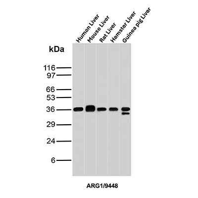 Formulation: Purified Ab WITHOUT BSA and Azide at 1.0mg/ml. Cellular Localization: Cytoplasm, Cytoplasmic granule. Positive Control: Human Liver, Mouse Liver, Rat Liver, Hamster Liver or Guinea pig Liver. Chromosome Location: 6q23. Protein Function: Key element of the urea cycle converting L-arginine to urea and L-ornithine, which is further metabolized into metabolites proline and polyamides that drive collagen synthesis and bioenergetic pathways critical for cell proliferation, respectively. the urea cycle takes place primarily in the liver and, to a lesser extent, in the kidneys , Functions in L-arginine homeostasis in nonhepatic tissues characterized by the competition between nitric oxide synthase (NOS) and arginase for the available intracellular substrate arginine. Arginine metabolism is a critical regulator of innate and adaptive immune responses. Involved in an antimicrobial effector pathway in polymorphonuclear granulocytes (PMN). Upon PMN cell death is liberated from the phagolysosome and depletes arginine in the microenvironment leading to suppressed T cell and natural killer (NK) cell proliferation and cytokine secretion (PubMed:15546957, PubMed:16709924, PubMed:19380772). In group 2 innate lymphoid cells (ILC2s) promotes acute type 2 inflammation in the lung and is involved in optimal ILC2 proliferation but not survival (By similarity). In humans, the immunological role in the monocytic/macrophage/dendritic cell (DC) lineage is unsure [The Uniprot Consortium]