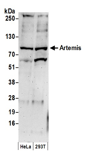 | Immunogen: | synthetic peptide. The epitope recognized by A300-234A-T maps to a region between residues 650 and the C-terminus (residue 692) of human DNA cross-link repair 1C (aka Artemis) using the numbering given in TrEMBL entry Q96SD1 (GeneID 64421). |