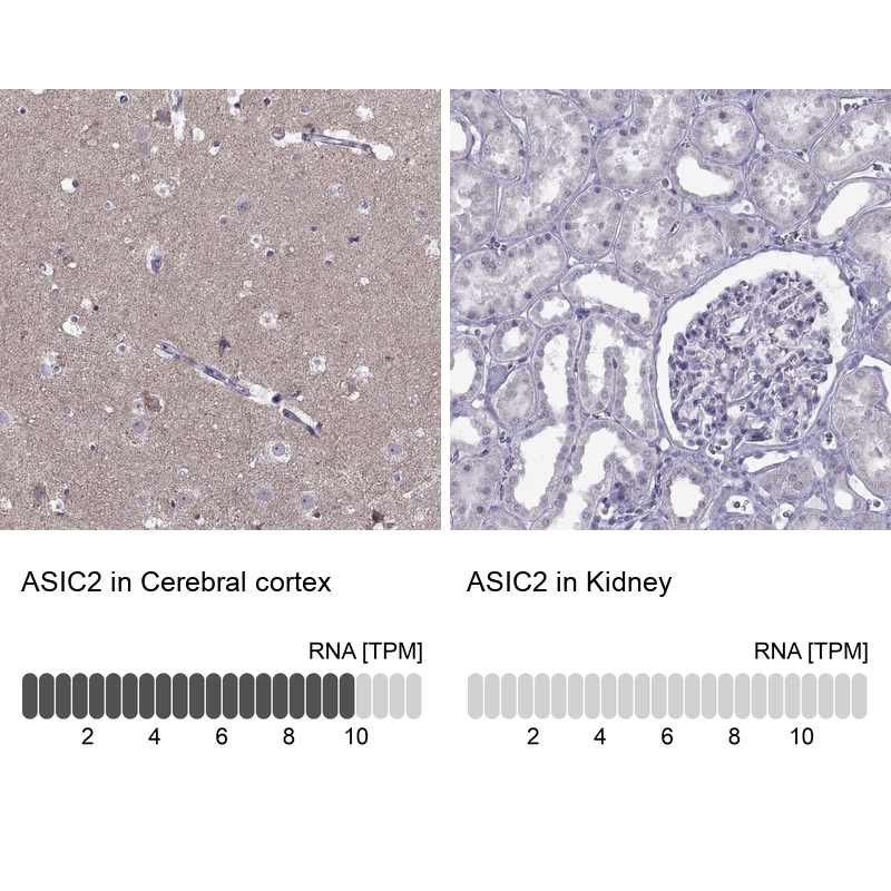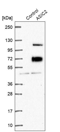 Protein function: Cation channel with high affinity for sodium, which is gated by extracellular protons and inhibited by the diuretic amiloride. Also permeable for Li(+) and K(+). Generates a biphasic current with a fast inactivating and a slow sustained phase. Heteromeric channel assembly seems to modulate. [The UniProt Consortium] Buffer: 40% glycerol and PBS (pH 7.2). 0.02% sodium azide is added as preservative. Highest antigen sequence identity to mouse: 99% and to rat: 51%