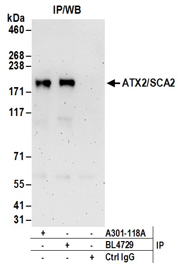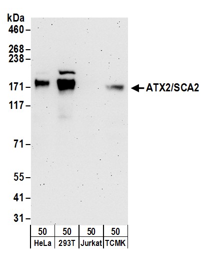 | Immunogen: | synthetic peptide. The epitope recognized by A301-118A-T maps to a region between residue 1262 and 1312 of human ataxin 2 (spinocerebellar ataxia 2) using the numbering given in entry NP_002964.2 (GeneID 6311). |