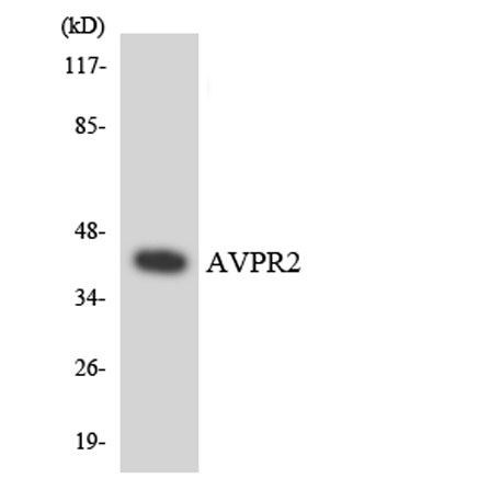 This gene encodes the vasopressin receptor, type 2, also known as the V2 receptor, which belongs to the seven-transmembrane-domain G protein-coupled receptor (GPCR) superfamily, and couples to Gs thus stimulating adenylate cyclase. The subfamily that includes the V2 receptor, the V1a and V1b vasopressin receptors, the oxytocin receptor, and isotocin and mesotocin receptors in non-mammals, is well conserved, though several members signal via other G proteins. All bind similar cyclic nonapeptide hormones. The V2 receptor is expressed in the kidney tubule, predominantly in the distal convoluted tubule and collecting ducts, where its primary property is to respond to the pituitary hormone arginine vasopressin (AVP) by stimulating mechanisms that concentrate the urine and maintain water homeostasis in the organism. When the function of this gene is lost, the disease Nephrogenic Diabetes Insipidus Protein function: Receptor for arginine vasopressin. The activity of this receptor is mediated by G proteins which activate adenylate cyclase. Involved in renal water reabsorption. [The UniProt Consortium] Recommended dilutions: Western Blot: 1/500 - 1/2000. Immunofluorescence: 1/200 - 1/1000. ELISA: 1/10000. Not yet tested in other applications.. Cellular localization: Cell membrane , Multi-pass membrane protein .