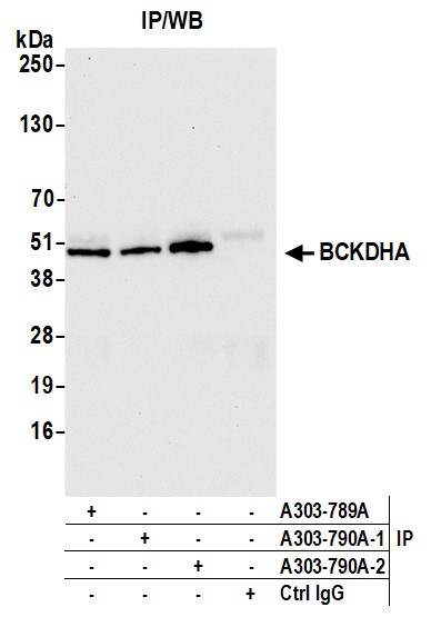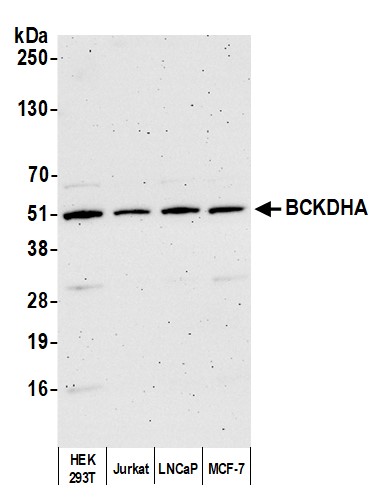 | Immunogen: | synthetic peptide. The epitope recognized by A303-790A-T maps to a region between residue 395 and 445 of human Branched chain keto acid dehydrogenase E1, alpha polypeptide using the numbering given in entry NP_000700.1 (GeneID 593). |
