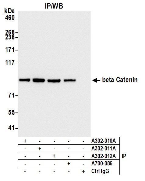 | Immunogen: | synthetic peptide. The epitope recognized by A302-011A-T maps to a region between residue 710 and 760 of human beta-catenin using the numbering given in entry NP_001895.1 (GeneID 1499). |