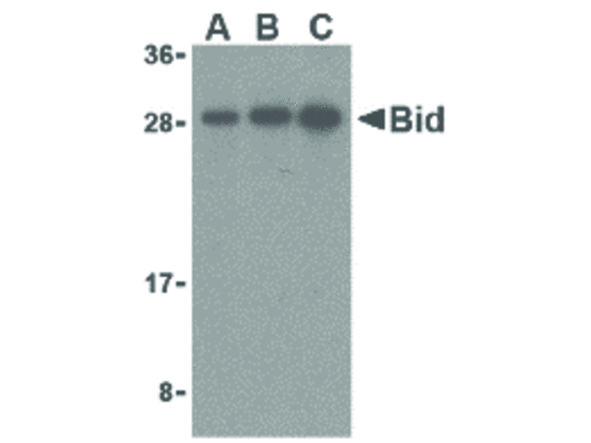 Anti-Bid Antibody is purified by ion exchange chromatography. Cross reactivity with Bid from other sources has not been determined. Protein function: The major proteolytic product p15 BID allows the release of cytochrome c. Isoform 1, isoform 2 and isoform 4 induce ICE-like proteases and apoptosis. Isoform 3 does not induce apoptosis. Counters the protective effect of Bcl-2. [The UniProt Consortium]