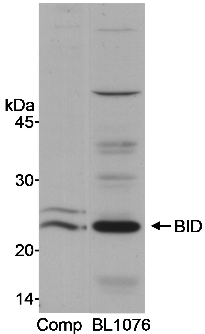 | Immunogen: | synthetic peptide. The epitope recognized by A300-167A-T maps to a region between residues 60 and 120 of human BH3 interacting domain death agonist using the number given in entry NP_932070.1 (GeneID 637). The epitope is found in isoforms 1 and 2 (but not isoform 3) of human BID. |