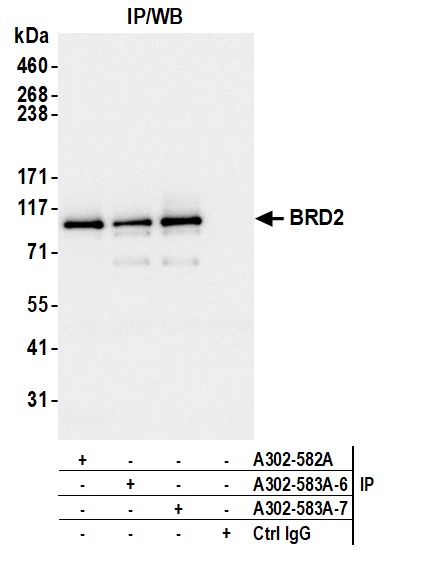 Immunogen: synthetic peptide. The epitope recognized by A302-583A-T maps to a region between residue 675 and 725 of human bromodomain containing 2 using the numbering given in entry NP_005095.1 (GeneID 6046).