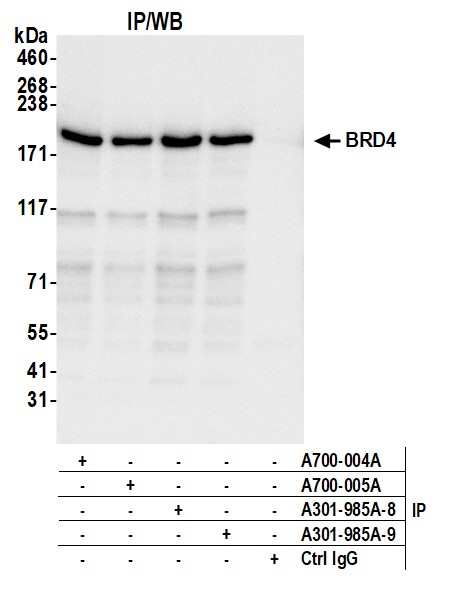 | Immunogen: | synthetic peptide. The epitope recognized by A301-985A maps to a region between residue 1312 and 1362 of human bromodomain-containing protein 4 using the numbering given in entry NP_490597.1 (GeneID 23476). |