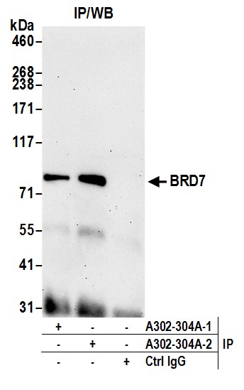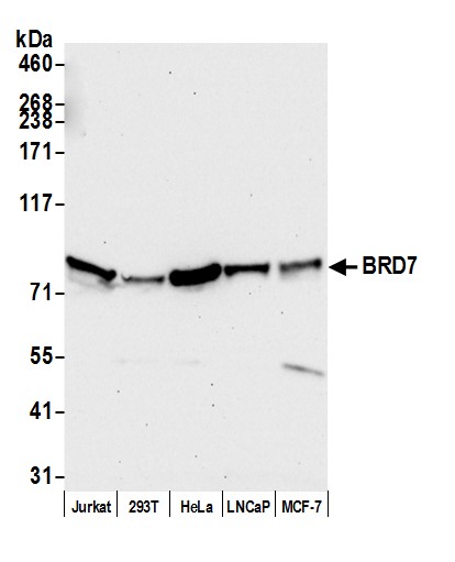 | Immunogen: | synthetic peptide. The epitope recognized by A302-304A-T maps to a region between residue 601 and 651 of human bromodomain containing 7 using the numbering given in entry NP_037395.2 (GeneID 29117). |