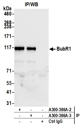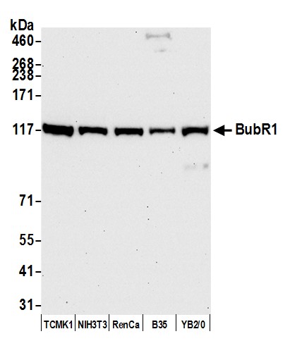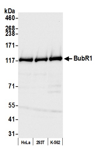 Immunogen: synthetic peptide. The epitope recognized by A300-386A-T maps to a region between residues 350 and 400 of human budding uninhibited by benzimidazoles 1 homolog beta using the numbering given in TrEMBL entry Q8WV50 (GeneID 701).