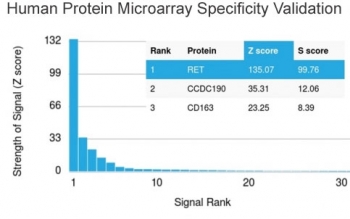1 mg/ml in 1X PBS, BSA free, sodium azide free. The Ret proto-oncogene is structurally related to the growing family of tyrosine kinase transmembrane receptors and is involved in GDNF signaling. RET expression is reported in several regions of the central nervous system, in the developing cranial nerve ganglia and a subset of cells within dorsal root ganglia, in motor neurons in the spinal cord and hindbrain, in neuro-retina and the growing tips of the renal collecting ducts in developing kidney.Alterations in RETgene are associated with diseases including papillary thyroid carcinoma, multiple endocrine neoplasia (type 2A and 2B), familial medullary thyroid carcinoma, and a congenital developmental disorder known as Hirschsprung's disease. Protein function: Receptor tyrosine-protein kinase involved in numerous cellular mechanisms including cell proliferation, neuronal navigation, cell migration, and cell differentiation upon binding with glial cell derived neurotrophic factor family ligands. Phosphorylates PTK2/FAK1. Regulates both cell death/survival balance and positional information. Required for the molecular mechanisms orchestration during intestine organogenesis, involved in the development of enteric nervous system and renal organogenesis during embryonic life, and promotes the formation of Peyer's patch-like structures, a major component of the gut-associated lymphoid tissue. Modulates cell adhesion via its cleavage by caspase in sympathetic neurons and mediates cell migration in an integrin (e.g. ITGB1 and ITGB3)-dependent manner. Involved in the development of the neural crest. Active in the absence of ligand, triggering apoptosis through a mechanism that requires receptor intracellular caspase cleavage. Acts as a dependence receptor, in the presence of the ligand GDNF in somatotrophs (within pituitary), promotes survival and down regulates growth hormone (GH) production, but triggers apoptosis in absence of GDNF. Regulates nociceptor survival and size. Triggers the differentiation of rapidly adapting (RA) mechanoreceptors. Mediator of several diseases such as neuroendocrine cancers, these diseases are characterized by aberrant integrins-regulated cell migration. Mediates, through interaction with GDF15-receptor GFRAL, GDF15-induced cell-signaling in the brainstem which induces inhibition of food-intake. Activates MAPK- and AKT- signaling pathways (PubMed:28846097, PubMed:28953886, PubMed:28846099). Isoform 1 in complex with GFRAL induces higher activation of MAPK- signaling pathway than isoform 2 in complex with GFRAL (PubMed:28846099). [The UniProt Consortium]