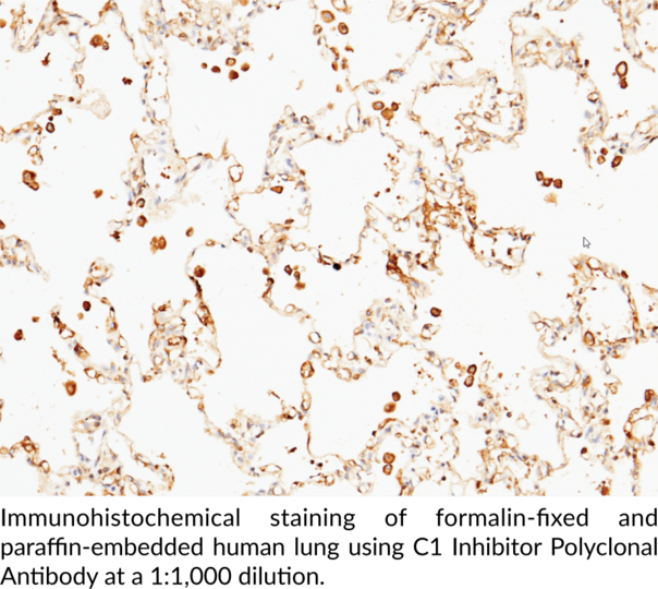 Plasma protease C1 inhibitor (C1 inhibitor) is a secreted plasma glycoprotein and member of the serine protease inhibitor (SERPIN) family. It is composed of an N-terminal domain and a serpin domain, which contains a reactive center loop (RCL). The RCL of C1 inhibitor mimics the target protease substrates and, upon cleavage, inactivates proteases via an irreversible covalent bond with the protease active site serine. C1 inhibitor targets several serine proteases, including complement 1r (C1r) and C1s, Factor XII, thrombin, and plasmin. It is involved in vascular permeability, extracellular matrix interactions, recognition of pathogens such as bacteria and parasites, ischemia-reperfusion injury, and transplant rejection. Knockout of the gene encoding C1 inhibitor, Serping1, increases vascular permeability in mice. Mutations in SERPING1 are associated with hereditary angioedema (HAE), and plasma levels of C1 inhibitor are increased in patients with COVID-19. Formulations containing recombinant human C1 inhibitor have been used in the prophylaxis of angioedema attacks. Cayman's C1 Inhibitor Polyclonal Antibody can be used for ELISA, immunohistochemistry paraffin (IHC-P), and Western blot (WB) applications. The antibody recognizes C1 inhibitor at 56 kDa from human samples.Synonyms: C1 Esterase Inhibitor, C1-INH, Plasma Protease C1 Inhibitor, Serine Protease Inhibitor Family G1, Serpin G1. Immunogen: Recombinant human C1 inhibitor. MW: 56 kDa. Formulation: (Request formulation change), 50, 100, or 200 µl of antigen affinity-purified polyclonal antibody. Storage Buffer: 0.2 µm filtered solution in PBS. Host: Rabbit. Isotype: IgG. Applications: WB,IHC-P, ELISA. Cross Reactivity: (+) C1 inhibitor.