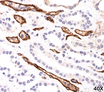 Prediluted in 1X PBS, 0.1 mg/ml BSA (US sourced), 0.05% sodium azide, *For IHC use only*. This antibody is specific to Complement 4d (C4d) and it reacts with the secreted as well as cell-bound protein. C4d is a degradation product of the activated complement factor C4b. Complement 4b is typically activated by binding of antibodies to specific target molecules. Following activation and degradation of the C4 molecule, thio-ester groups are exposed, which allow transient, covalent binding of the degradation product C4d to endothelial cell surfaces and extracellular matrix components of vascular basement membranes near the sites of C4 activation. The presence of C4d in peritubular capillaries is a key indicator for acute humoral (i.e. antibody-mediated) rejection of kidney, heart, pancreas and lung allografts. As an established marker of antibody-mediated acute renal allograft rejection and its proclivity for endothelium, this component can be detected in peritubular capillaries in chronic renal allograft rejection as well as hyperacute rejection, acute vascular rejection, acute cellular rejection, and borderline rejection. C4d has been shown to be a significant predictor of transplant kidney graft survival. C4d antibody, combined with antibody to C3d, can be utilized as a tool for diagnosis of allograft rejection that may warrant a prompt and aggressive anti-rejection treatment.