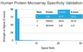0.2 mg/ml in 1X PBS with 0.1 mg/ml BSA (US sourced) and 0.05% sodium azide. The protein encoded by this gene was initially named CA-related protein because of sequence similarity to other known carbonic anhydrase genes. However, the gene product lacks carbonic anhydrase activity (i.e., the reversible hydration of carbon dioxide). The gene product continues to carry a carbonic anhydrase designation based on clear sequence identity to other members of the carbonic anhydrase gene family. The absence of CA8 gene transcription in the cerebellum of the lurcher mutant in mice with a neurologic defect suggests an important role for this acatalytic form. Mutations in CA8 (carbonic anhydrase 8) gene causes neuropathology, such as ataxia, mild mental retardation and the predisposition to quadrupedal gait. It is also associated with the development of colorectal and lung cancers. Additionally, it is upregulated in various cancers. Protein function: Does not have a carbonic anhydrase catalytic activity. [The UniProt Consortium]