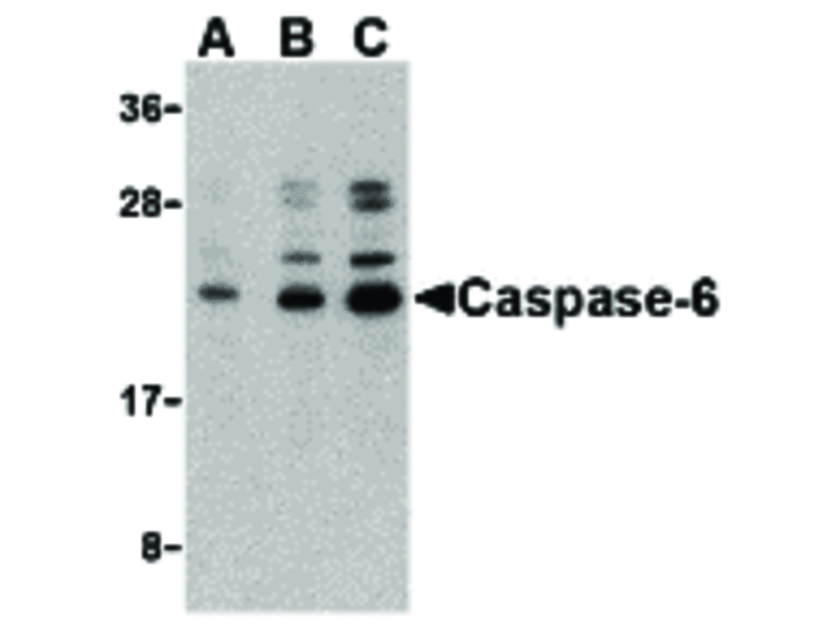 Anti-Caspase-6 Antibody was affinity purified from monospecific antiserum by immunoaffinity chromatography. Depending on cell lines or tissues used, either full-length or other cleavage products may be observed. Protein function: Involved in the activation cascade of caspases responsible for apoptosis execution. Cleaves poly(ADP-ribose) polymerase in vitro, as well as lamins. Overexpression promotes programmed cell death. [The UniProt Consortium]