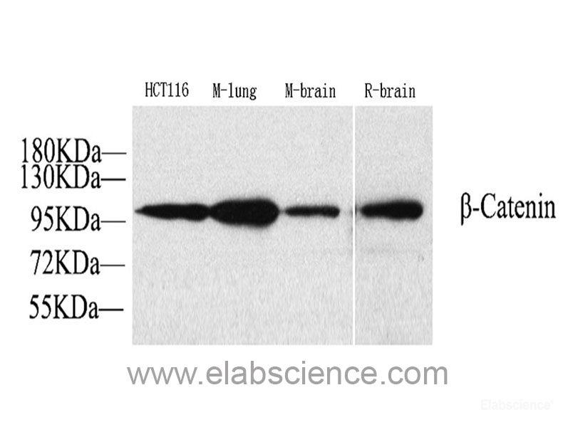 CTNNB1,also known as ß-Catenin,is an evolutionarily conserved,multifunctional intracellular protein. CTNNB1 was originally identified in cell adherens junctions (Ajs) where it functions to bridge the cytoplasmic domain of cadherins to a-catenin and the actin cytoskeleton. Besides its essential role in the Ajs,CTNNB1 is also a key downstream component of the canonical Wnt pathway that plays diverse and critical roles in embryonic development and adult tissue homeostasis. Deregulation of CTNNB1 activity is associated with multiple diseases including cancers. . Protein function: Key downstream component of the canonical Wnt signaling pathway. In the absence of Wnt, forms a complex with AXIN1, AXIN2, APC, CSNK1A1 and GSK3B that promotes phosphorylation on N-terminal Ser and Thr residues and ubiquitination of CTNNB1 via BTRC and its subsequent degradation by the proteasome. In the presence of Wnt ligand, CTNNB1 is not ubiquitinated and accumulates in the nucleus, where it acts as a coactivator for transcription factors of the TCF/LEF family, leading to activate Wnt responsive genes. Involved in the regulation of cell adhesion, as component of an E- cadherin:catenin adhesion complex. Acts as a negative regulator of centrosome cohesion. Involved in the CDK2/PTPN6/CTNNB1/CEACAM1 pathway of insulin internalization. Blocks anoikis of malignant kidney and intestinal epithelial cells and promotes their anchorage-independent growth by down-regulating DAPK2. Disrupts PML function and PML-NB formation by inhibiting RANBP2-mediated sumoylation of PML (PubMed:17524503, PubMed:18077326, PubMed:18086858, PubMed:18957423, PubMed:21262353, PubMed:22647378, PubMed:22699938, PubMed:22155184). Promotes neurogenesis by maintaining sympathetic neuroblasts within the cell cycle. [The UniProt Consortium]