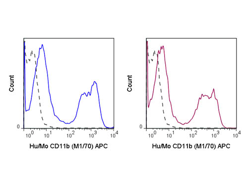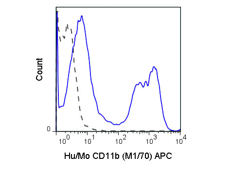 Allophycocyanin conjugated CD11b Monoclonal Antibody was purified from tissue culture supernatant via affinity chromatography and is directed against mouse CD11b. Cross reactive to Human, Chimpanzee, Baboon, Cynomolgus, and Rhesus. The antibody is also reported to be cross-reactive for Rhesus macaque CD11b. Cross reactivity with CD11b from other sources has not been tested. Anti-CD11b is conjugated with APC under optimal conditions and the solution is free of unconjugated APC.