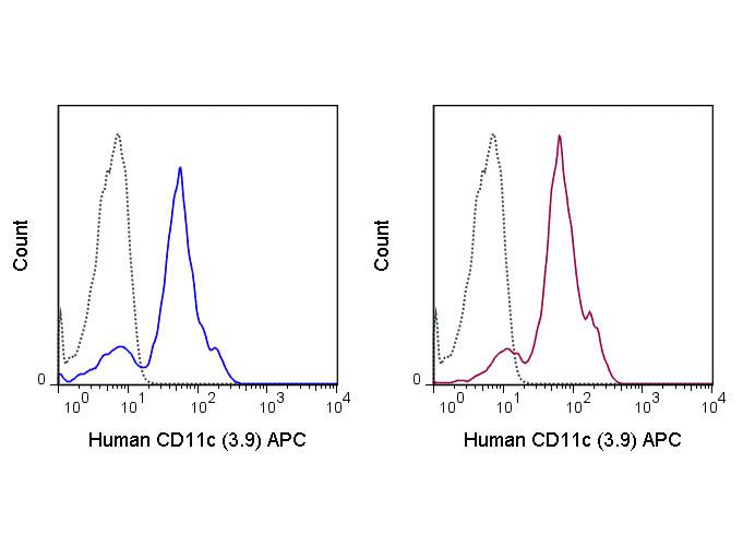 Allophycocyanin conjugated CD11c Monoclonal Antibody was purified from tissue culture supernatant via affinity chromatography and is directed against human CD11c. Reactivity is observed against human CD11c, Baboon, Chimpanzee, Cynomolgus, and Rhesus. Cross reactivity with CD11c from other sources has not been tested. Anti-CD11c is conjugated with APC under optimal conditions and the solution is free of unconjugated APC. Protein function: Integrin alpha-X/beta-2 is a receptor for fibrinogen. It recognizes the sequence G-P-R in fibrinogen. It mediates cell-cell interaction during inflammatory responses. It is especially important in monocyte adhesion and chemotaxis. [The UniProt Consortium]