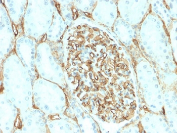 1 mg/ml in 1X PBS, BSA free, sodium azide free. This antibody recognizes a transmembrane, heavily glycosylated protein of 90-120kDa, which is identified as CD34. Its expression is a hallmark for identifying pluripotent hematopoietic stem or progenitor cells. Its expression is gradually lost as lineage committed progenitors differentiate. CD34 is a marker of choice for staining blasts in acute myeloid leukemia. In addition, it is expressed by soft tissue tumors, such as solitary fibrous tumor and gastrointestinal stromal tumor. CD34 expression is also found in vascular endothelium. Additionally, proliferating endothelial cells overexpress this molecule than the non-proliferating endothelial cells. Anti-CD34 labels >85% of angiosarcoma and Kaposi's sarcoma, but shows low specificity. Protein function: Possible adhesion molecule with a role in early hematopoiesis by mediating the attachment of stem cells to the bone marrow extracellular matrix or directly to stromal cells. Could act as a scaffold for the attachment of lineage specific glycans, allowing stem cells to bind to lectins expressed by stromal cells or other marrow components. Presents carbohydrate ligands to selectins. [The UniProt Consortium]