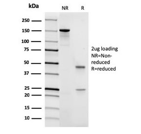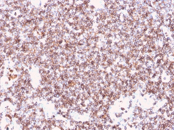 0.2 mg/ml in 1X PBS with 0.1 mg/ml BSA (US sourced), 0.05% sodium azide. CD45R, also designated CD45 and PTPRC, has been identified as a transmembrane glycoprotein, broadly expressed among hematopoietic cells. Multiple isoforms of CD45R are distributed throughout the immune system according to cell type. These isoforms arise because of alternative splicing of exons 4, 5, and 6. The corresponding protein domains are characterized by the binding of monoclonal antibodies specific for CD45RA (exon 4), CD45RB (exon 5), CD45RC (exon 6) and CD45RO (exons 4 to 6 spliced out). The variation in these isoforms is localized to the extracellular domain of CD45R, while the intracellular domain is conserved. CD45R functions as a phosphor-tyrosine phosphatase. Antibody to CD45 is useful in differential diagnosis of lymphoid tumors from non-hematopoietic undifferentiated neoplasms. Protein function: Protein tyrosine-protein phosphatase required for T-cell activation through the antigen receptor. Acts as a positive regulator of T-cell coactivation upon binding to DPP4. The first PTPase domain has enzymatic activity, while the second one seems to affect the substrate specificity of the first one. Upon T-cell activation, recruits and dephosphorylates SKAP1 and FYN. Dephosphorylates LYN, and thereby modulates LYN activity. [The UniProt Consortium]