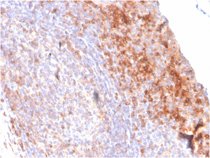Formulation: Purified Ab with BSA and Azide at 200ug/ml. Cellular Localization: Membrane. Positive Control: Rajior Ramos cells. Human tonsil, spleen or thymus. Chromosome Location: 3q13.3-q21. Protein Function: Costimulatory molecule that belongs to the immunoglobulin superfamily that plays an important role in T-lymphocyte activation (PubMed:38467718). Acts as the primary auxiliary signal augmenting the MHC/TCR signal in naive T-cells together with the CD28 receptor which is constitutively expressed on the cell surface of T-cells (PubMed:12196291). In turn, activates different signaling pathways such as NF-kappa-B or MAPK leading to the production of different cytokines (PubMed:10438913). In addition, CD28/CD80 costimulatory signal stimulates glucose metabolism and ATP synthesis of T-cells by activating the PI3K/Akt signaling pathway (PubMed:12121659). Also acts as a regulator of PDL1/PDCD1 interactions to limit excess engagement of PDL1 and its inhibitory role in immune responses (PubMed:36727298). Expressed on B-cells, plays a critical role in regulating interactions between B-cells and T-cells in both early and late germinal center responses, which are crucial for the generation of effective humoral immune responses (By similarity) , (Microbial infection) Acts as a receptor for adenovirus subgroup B [The Uniprot Consortium]