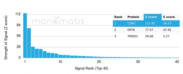 Formulation: Purified Ab WITHOUT BSA and Azide at 1.0mg/ml. Cellular Localization: Membrane. Positive Control: Rajior Ramos cells. Human tonsil, spleen or thymus. Chromosome Location: 3q13.3-q21. Protein Function: Costimulatory molecule that belongs to the immunoglobulin superfamily that plays an important role in T-lymphocyte activation (PubMed:38467718). Acts as the primary auxiliary signal augmenting the MHC/TCR signal in naive T-cells together with the CD28 receptor which is constitutively expressed on the cell surface of T-cells (PubMed:12196291). In turn, activates different signaling pathways such as NF-kappa-B or MAPK leading to the production of different cytokines (PubMed:10438913). In addition, CD28/CD80 costimulatory signal stimulates glucose metabolism and ATP synthesis of T-cells by activating the PI3K/Akt signaling pathway (PubMed:12121659). Also acts as a regulator of PDL1/PDCD1 interactions to limit excess engagement of PDL1 and its inhibitory role in immune responses (PubMed:36727298). Expressed on B-cells, plays a critical role in regulating interactions between B-cells and T-cells in both early and late germinal center responses, which are crucial for the generation of effective humoral immune responses (By similarity) , (Microbial infection) Acts as a receptor for adenovirus subgroup B [The Uniprot Consortium]