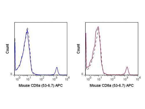 Allophycocyanin conjugated CD8a Monoclonal Antibody was purified from tissue culture supernatant via affinity chromatography and is directed against mouse CD8a. Cross reactivity with CD8a from other sources has not been tested. Anti-CD8a is conjugated with APC under optimal conditions and the solution is free of unconjugated APC. Protein function: Identifies cytotoxic/suppressor T-cells that interact with MHC class I bearing targets. CD8 is thought to play a role in the process of T-cell mediated killing. CD8 alpha chains binds to class I MHC molecules alpha-3 domains. [The UniProt Consortium]