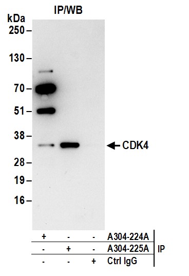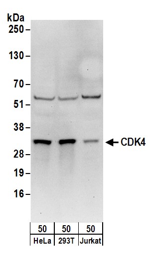 | Immunogen: | synthetic peptide. The epitope recognized by A304-225A-T maps to a region between residue 253 to 303 of human Cyclin-Dependent Kinase 4 using the numbering given in entry NP_000066.1 (GeneID 1019). |