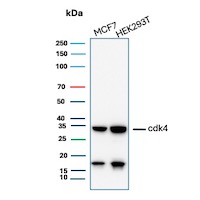 Formulation: Purified Ab with BSA and Azide at 200ug/ml. Cellular Localization: Nucleus. Cytoplasm. Positive Control: MCF7, HEK293T, cervical carcinoma and liposarcomas., Human urothelial carcinoma, K-562. Chromosome Location: 12q14.1. Protein Function: Ser/Thr-kinase component of cyclin D-CDK4 (DC) complexes that phosphorylate and inhibit members of the retinoblastoma (RB) protein family including RB1 and regulate the cell-cycle during G(1)/S transition. Phosphorylation of RB1 allows dissociation of the transcription factor E2F from the RB/E2F complexes and the subsequent transcription of E2F target genes which are responsible for the progression through the G(1) phase. Hypophosphorylates RB1 in early G(1) phase. Cyclin D-CDK4 complexes are major integrators of various mitogenenic and antimitogenic signals. Also phosphorylates SMAD3 in a cell-cycle-dependent manner and represses its transcriptional activity. Component of the ternary complex, cyclin D/CDK4/CDKN1B, required for nuclear translocation and activity of the cyclin D-CDK4 complex [The Uniprot Consortium]