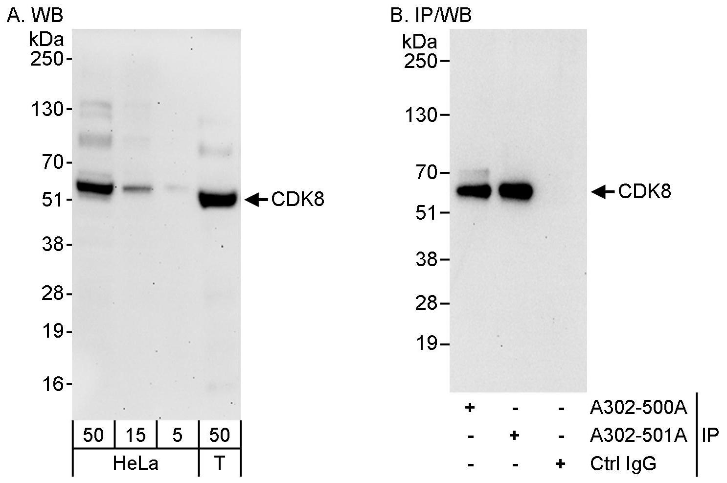 | Immunogen: | synthetic peptide. The epitope recognized by A302-501A-T maps to a region between residue 420 and 470 of human cyclin-dependent kinase 8 using the numbering given in entry NP_001251.1 (GeneID 1024). |