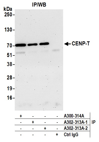 | Immunogen: | synthetic peptide. The epitope recognized by A302-313A-T maps to a region between residue 480 and 520 of human centromere protein T using the numbering given in entry NP_079358.3 (GeneID 80152). |