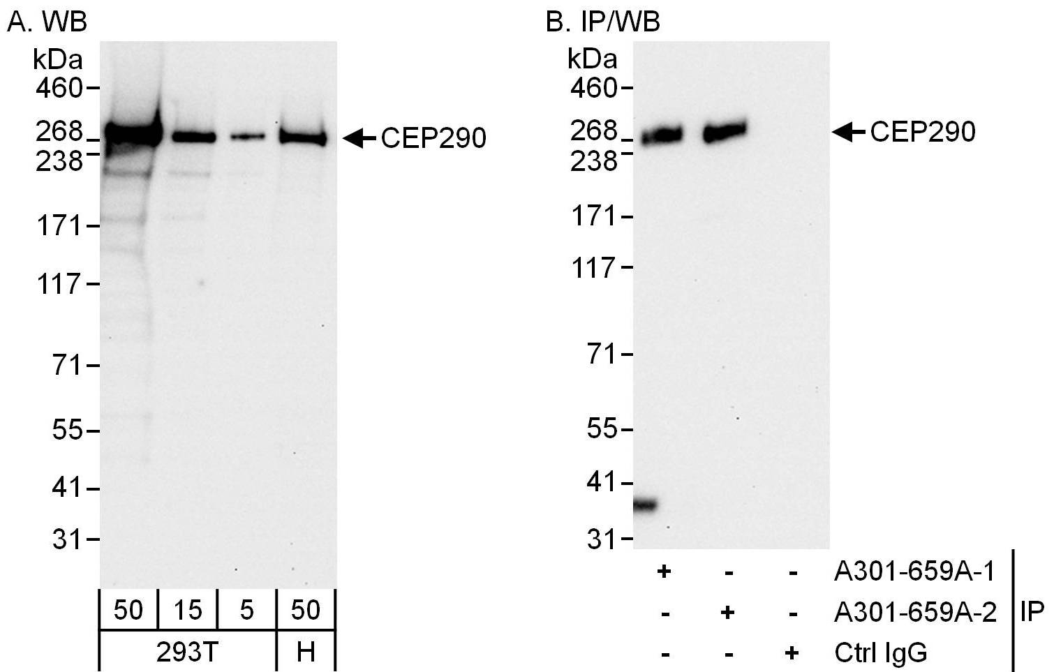 | Immunogen: | synthetic peptide. The epitope recognized by A301-659A-T maps to a region between residue 2429 and 2479 of human centrosomal protein 290kDa using the numbering given in entry NP_079390.3 (GeneID 80184). |