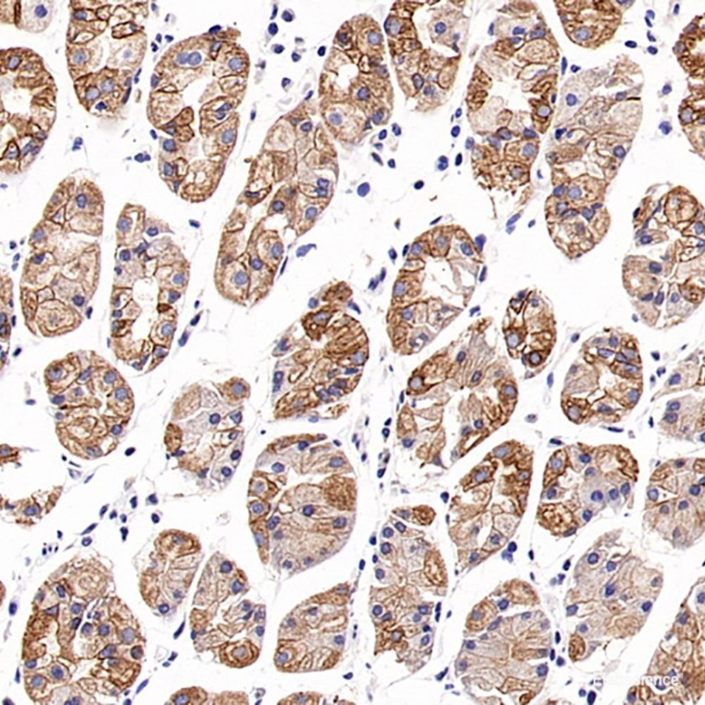 Cytokeratin 18 (CK18) has a molecular weight of 45 KDa, which is a low molecular weight type A cytokeratin. It is a marker of simple epithelium, including glandular epithelium. The stratified squamous epithelium is generally negative. CK18 is mainly used in the diagnosis of adenocarcinoma. Protein function: Involved in the uptake of thrombin-antithrombin complexes by hepatic cells. When phosphorylated, plays a role in filament reorganization. Involved in the delivery of mutated CFTR to the plasma membrane. Together with KRT8, is involved in interleukin-6 (IL-6)-mediated barrier protection. [The UniProt Consortium]