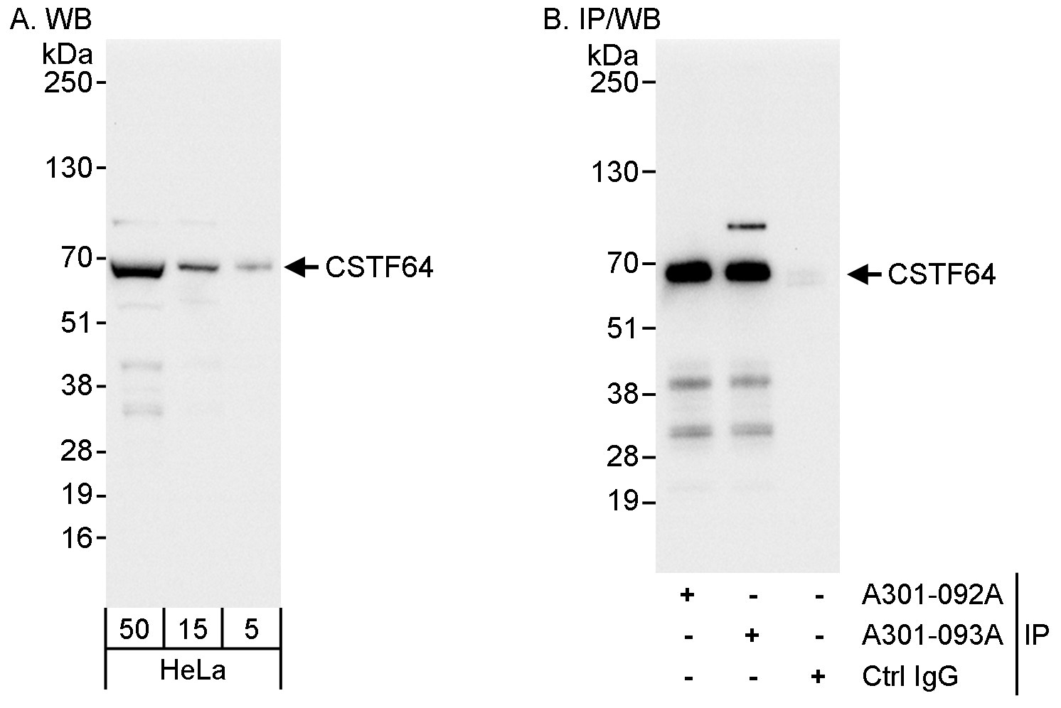 Immunogen: synthetic peptide. The epitope recognized by A301-093A-T maps to a region between residue 527 and 577 of human cleavage stimulation factor, 3' pre-RNA, subunit 2, 64kDa using the numbering given in entry NP_001316.1 (GeneID 1478).