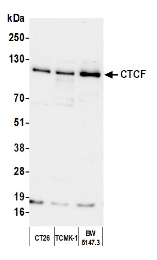 | Immunogen: | synthetic peptide. The epitope recognized by A300-543A-T maps to a region between residues 650 and 700 of human CCCTC-binding factor using the numbering given in entry NP_006556.1 (GeneID 10664). |