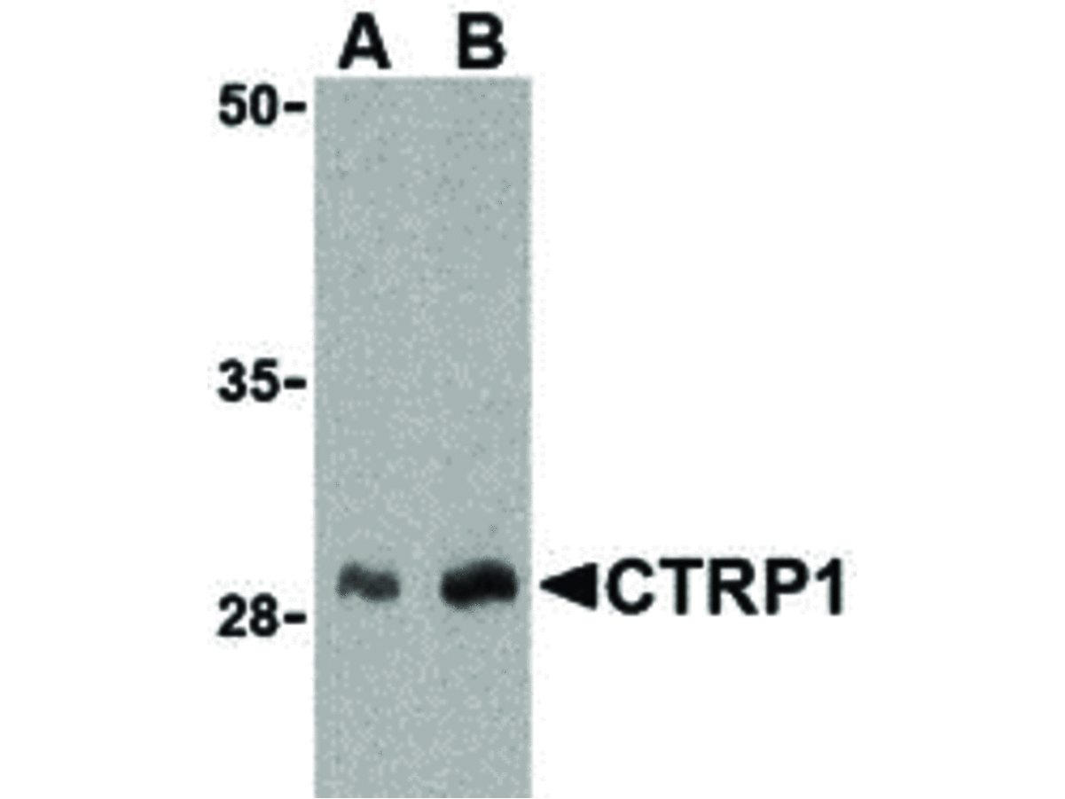 Anti-CTRP1 Antibody was affinity purified from monospecific antiserum by immunoaffinity chromatography. These proteins are often highly modified post-translationally and migrate in SDS-PAGE at positions other than their predicted size.