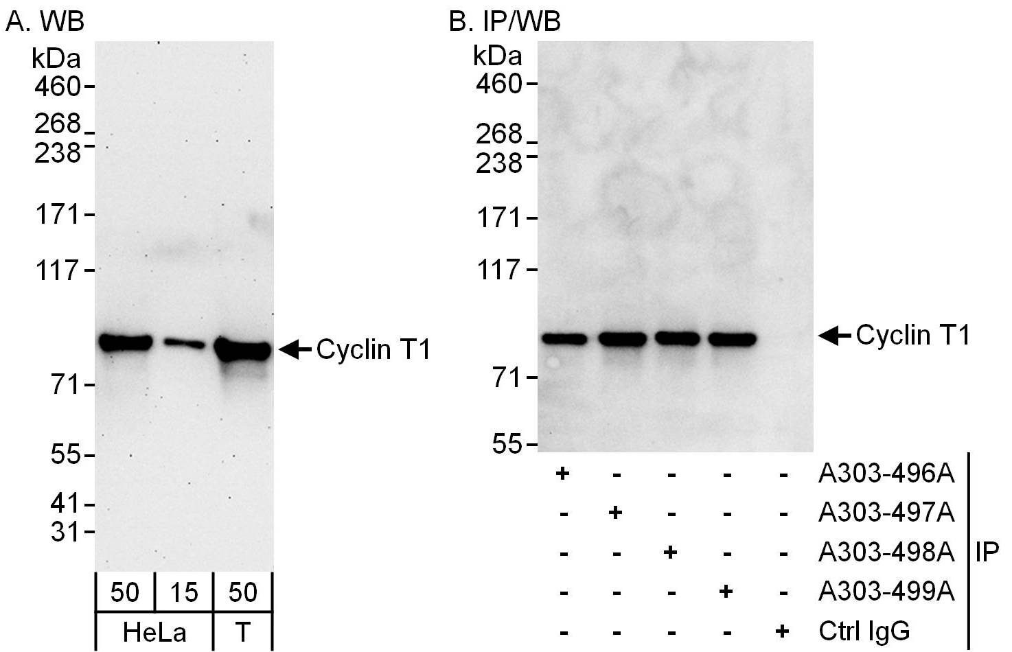 | Immunogen: | synthetic peptide. The epitope recognized by A303-499A-T maps to a region between residue 625 and 675 of human Cyclin T1 using the numbering given in entry NP_001231.2 (GeneID 904). |