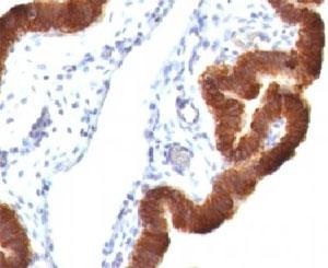 Prediluted in 1X PBS, 0.1 mg/ml BSA (US sourced), 0.05% sodium azide, *For IHC use only*. Recognizes a protein of 40kDa, identified as cytokeratin-19 (CK19), which is expressed in sweat gland, mammary gland ductal and secretory cells, bile ducts, gastrointestinal tract, bladder urothelium, oral epithelia, esophagus, and ectocervical epithelium. Anti-CK19 reacts with a wide variety of epithelial malignancies including adenocarcinomas of the colon, stomach, pancreas, biliary tract, liver, and breast. Perhaps the most useful application is the identification of thyroid carcinoma of the papillary type, although 50%-60% of follicular carcinomas are also labeled. Anti-CK19 is a useful marker for detection of tumor cells in lymph nodes, peripheral blood, bone marrow and breast cancer. Protein function: Involved in the organization of myofibers. Together with KRT8, helps to link the contractile apparatus to dystrophin at the costameres of striated muscle. [The UniProt Consortium]